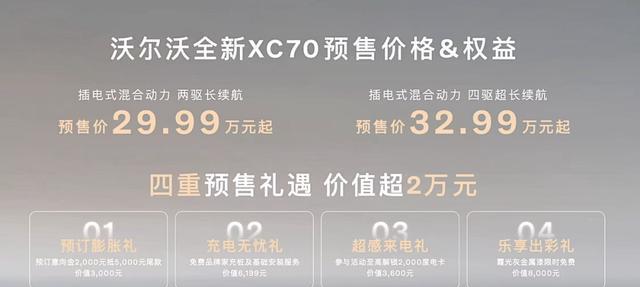 沃尔沃全新XC70在8月27号开始预售,推出两个版本,价格29.99万到32.99万。买车能享限时优惠,比如金融补贴和终身基础保养。沃尔沃说这是今年最重要的车型,要在豪华混动市场搞点动静。