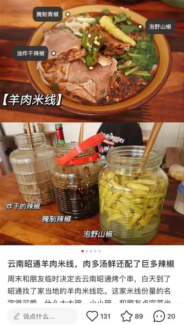 昭通羊肉米线与三种不同处理手法的辣椒,讲究。(图/小红书截图)